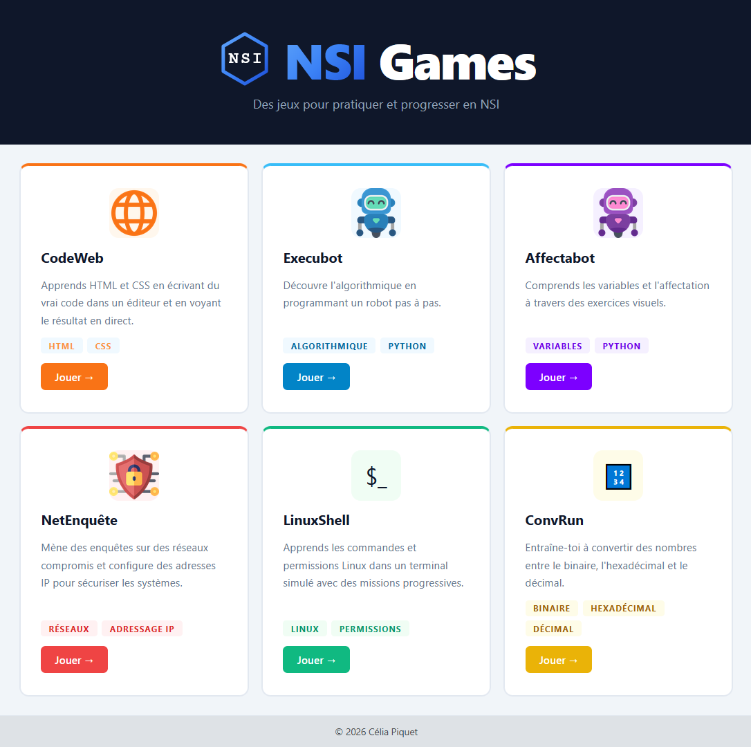 Voici l'application en ligne NSI Games et en particulier Execubot utilisée lors de la visite des collégiennes au lycée.