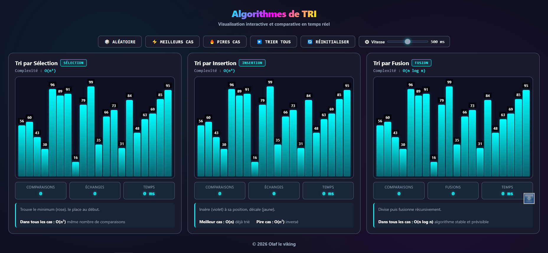 Ainsi, pour une taille de tableau donnée, il y a toujours le même nombre de comparaisons, il n’y a donc pas de pire ou meilleur cas (tous les tableaux sont des pires cas). Cela vient du fait que l’on connaît toujours à l’avance le nombre de tours de boucle puisqu’il s’agit de deux boucles pour.