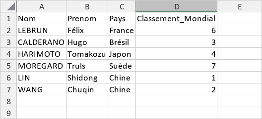 {'Id': 1, 'Nom': 'LEBRUN', 'Prenom': 'Félix', 'Pays': 'France', 'Classement_Mondial': 6},