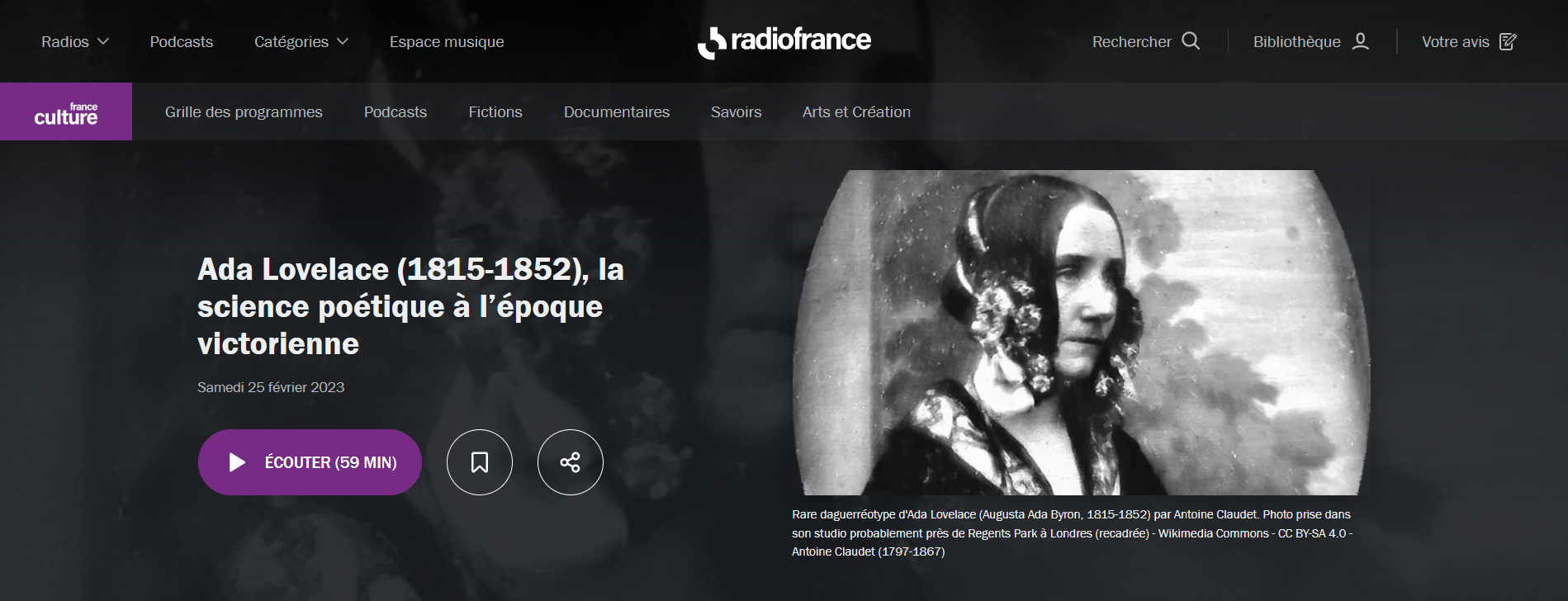 Histoire de l'informatique Ada Lovelace (1815-1852), la science poétique à l'époque victorienne⚓︎ Podcast de France Culture (59:00) (Le) Modèle Turing⚓︎ Vidéo du CNRS (29:04)
